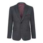 Elegancka, ciemnoszara męska marynarka w kratę w fasonie SLIM FIT. Idealnie podkreśla walory męskiej sylwetki. Model jednorzędowy, zapinany na 2 guziki. Z tyłu dwa rozcięcia. Posiada 2 kieszenie z klapami i małą kieszonkę piersiową z wzorzystą poszetką. Stylowe guziki dopełniają całości.