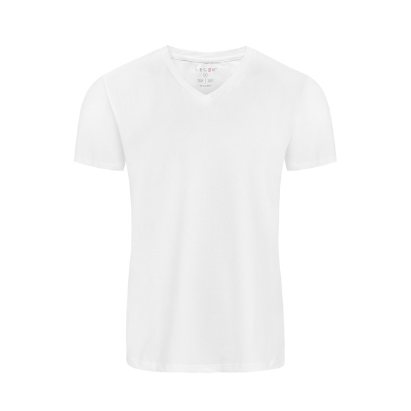 Klasyczny męski T-shirt z krótkim rękawem i okrągłym dekoltem V-neck. Wykonany z dzianiny bawełnianej z dodatkiem elastanu o solidnej gramaturze — materiał nie jest cienki ani prześwitujący, dzięki czemu koszulka zachowuje estetyczny wygląd podczas noszenia. Minimalistyczny charakter modelu podkreśla delikatny nadruk „LEGER” umieszczony na prawym rękawku.